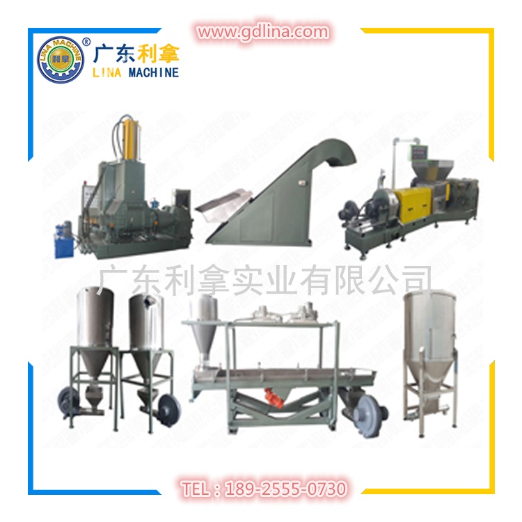 密煉機---斗式上料機---強制喂料造粒機---模面熱切粒機---離心旋風筒---振動送料機---出料桶
